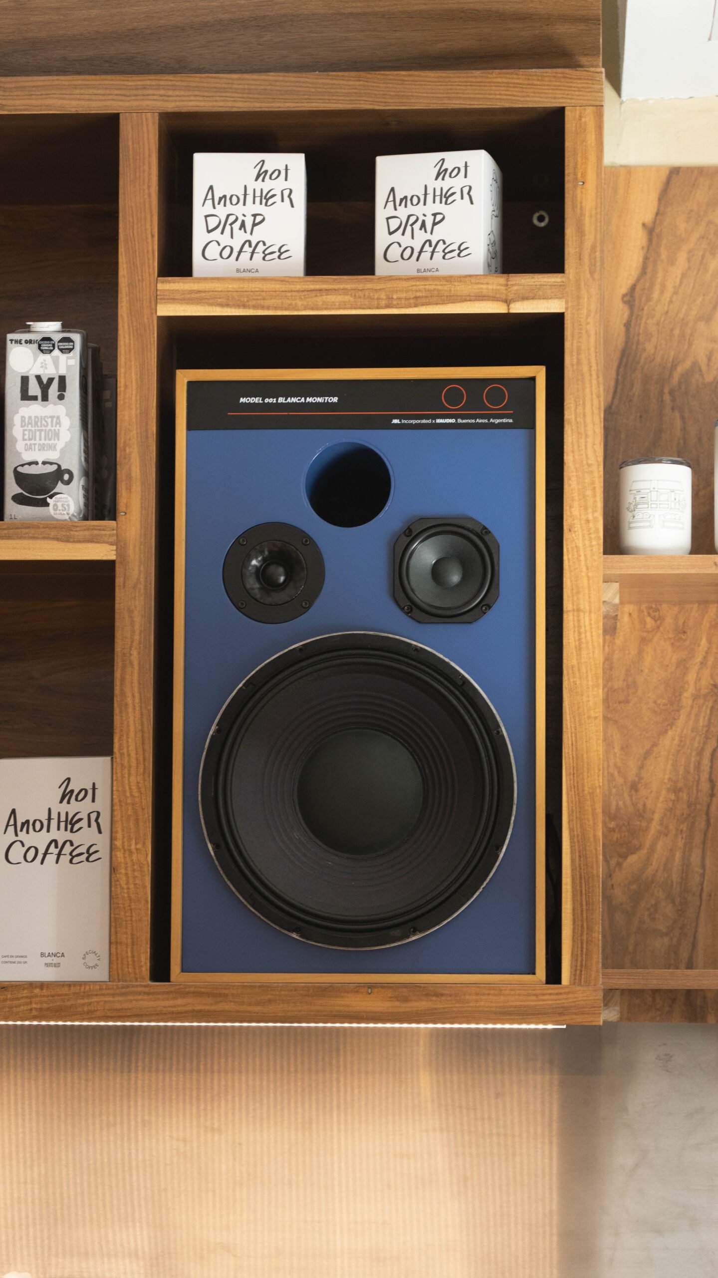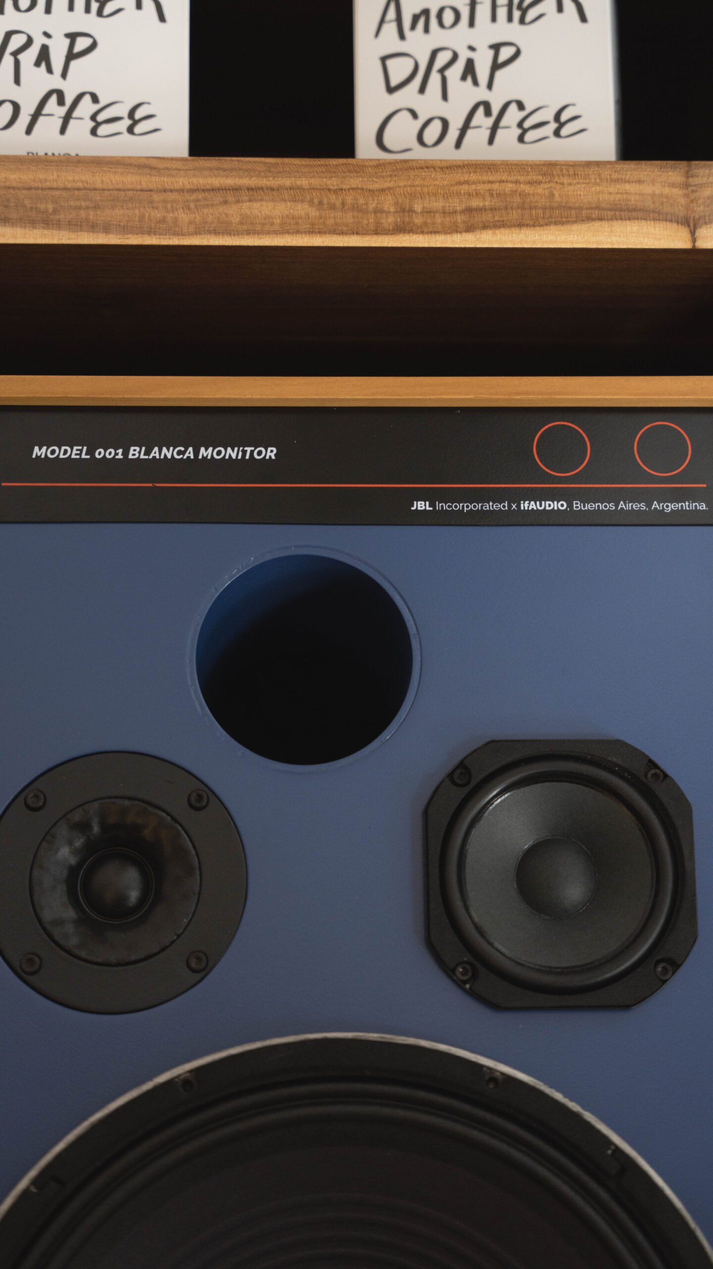 Desarrollamos a medida un par de bafles con componentes JBL, lo cual brinda la calidad de audio que se buscaba. Respetamos también su estética manteniendo el azul característico de estos altavoces e incorporando el sello propio en el listón superior con el nombre alusivo a este proyecto.